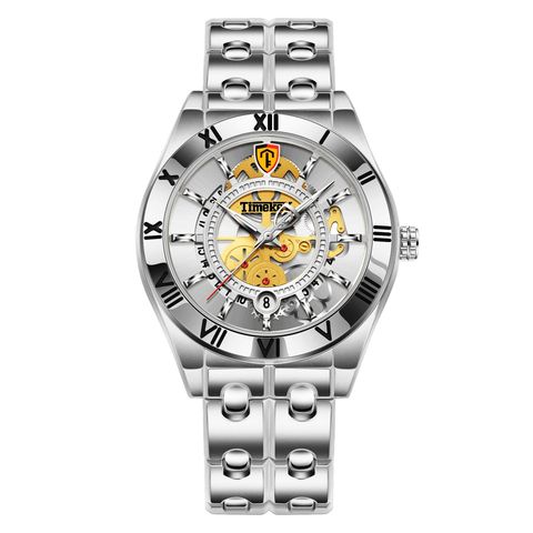 Reloj de cuarzo para hombre, escala numérica romana, banda de acero inoxidable, caja de aleación, perspectiva hueca, movimiento, esfera, puntero, Perla
